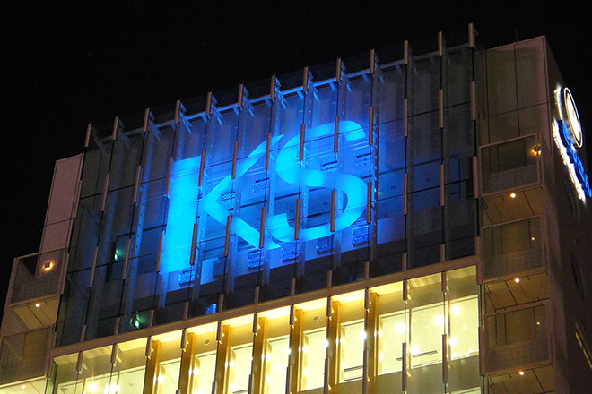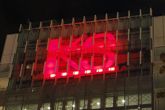 ■電源OFF時(不透明時)には室内よりLED照明器具で液晶フィルムシートを照明することで、ガラス壁面に文字を浮かび上がらせる。